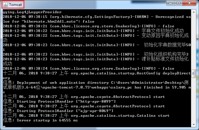 打开系统服务后会出现一个黑色窗口Tomcat,此窗口在使用期间不能关闭,升级后需要重启程序时,需要关闭程序和页面和Tomcat黑窗口,Tomcat如下图所示: